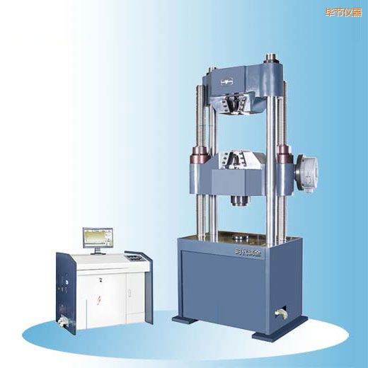 WAW-300C/600C/1000C型微機(jī)控制電液伺服萬能試驗機(jī),,主要用于金屬、非金屬的拉伸、壓縮、彎曲、剪切等試驗。增加簡單的附具和裝置,還能對木材、水泥、混凝土、橡膠及其制品進(jìn)行試驗。 GB/T 228.1-2010《金屬材料 拉伸試驗 第1部分 室溫試驗方法》 1.WAW-300C/600C/1000C型微機(jī)控制電液伺服萬能試驗機(jī),采用油缸下置式主機(jī),拉伸空間位于主機(jī)的上方,,壓縮、彎曲試驗空間位于主機(jī)下橫梁和工作臺之間油缸活塞采用間隙密封經(jīng)久耐用 2.下橫梁升降采用盤式電機(jī)、蝸輪蝸桿、螺母轉(zhuǎn)動帶動橫梁升降 3.高精度油壓傳感器測力測量精度高,,便于維修更換 4.采用進(jìn)口液壓油泵 5.采用進(jìn)口電液伺服閥控制精度高 6.高精度測控系統(tǒng)控制精度高(自主產(chǎn)權(quán)) 7.軟件技術(shù)(自主產(chǎn)權(quán))…….