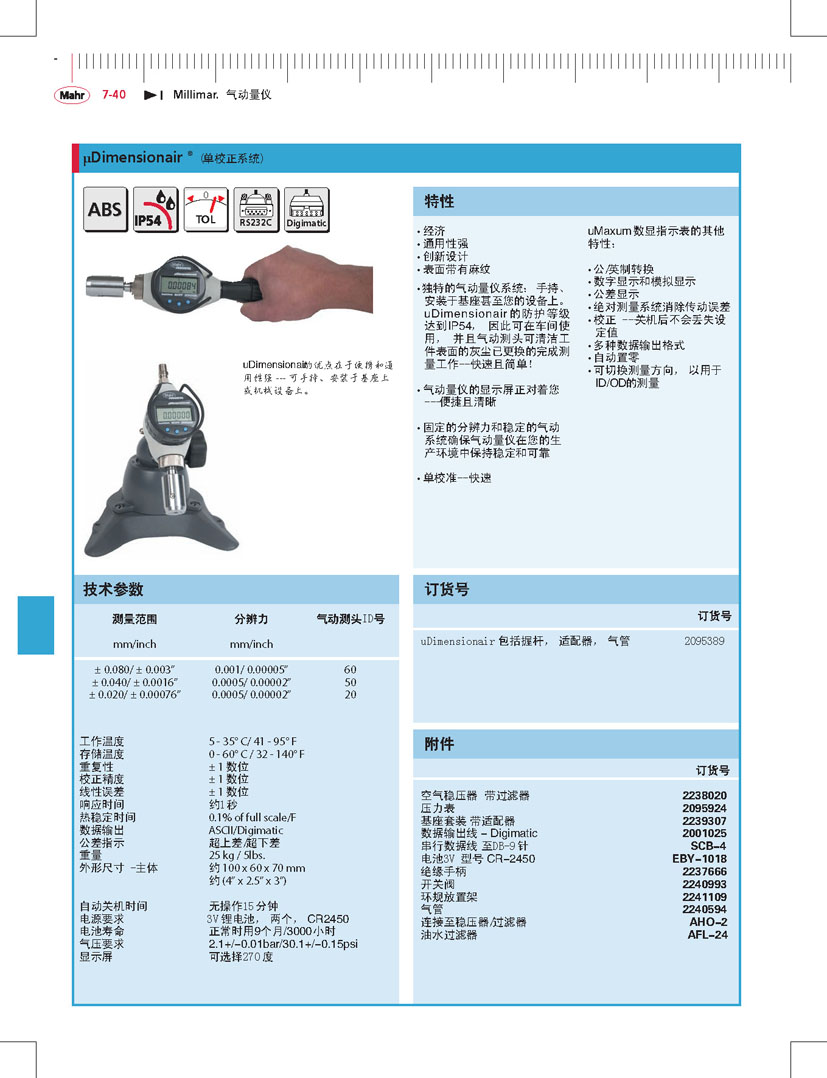 特點 沒有一種氣動量規(guī)系統(tǒng)能夠像微型氣動尺度儀可以手持或放置在工作臺甚至是機(jī)床的合適位置,,微型氣動尺度儀的防水等級為IP-54,, 因此可以在車間內(nèi)使用,,并且可以用壓縮空氣清潔微型氣動尺度儀—方便快捷。