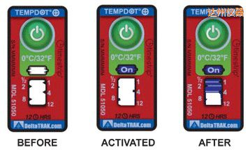 TempDot™Plus標簽應(yīng)存儲在室溫下,并必須在反應(yīng)溫度閾值以上被激活。激活是通過用手指推壓。"On"字出現(xiàn)在第一個窗口中顯示激活。之后5分 鐘內(nèi),在反應(yīng)溫度或低于反應(yīng)溫度的情況下將標簽貼到產(chǎn)品上。藍色染料熔化并以控制的速率遷移,,經(jīng)過白色大窗口。這表示暴露在溫度閾值以上的累計時間。當溫 度低于閾值時,,該染料固化并停止移動。如果溫度超過閾值,,TempDot®Plus標簽提供即時的視覺跡象。