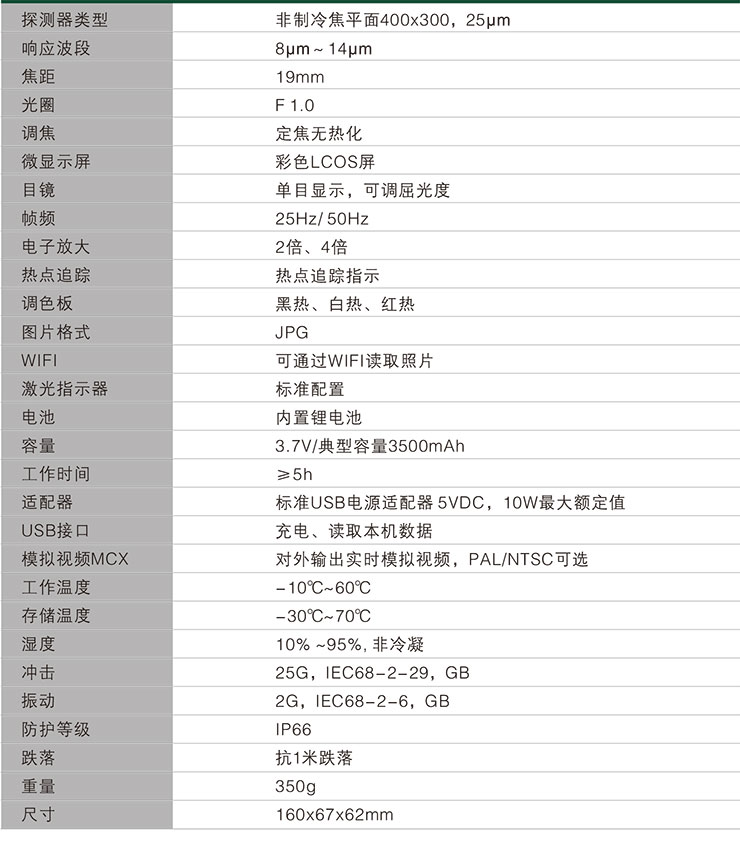 產(chǎn)品特點 可拍照,并通過WIFI分享所拍攝照片,醫(yī)用紅外熱像儀價格,方便多人同時瀏覽 直觀的按鍵功能操作,進口紅外熱像儀廠家,無需培訓,符合人體工學設計,長期使用依 舊舒適 超靜音和防漏光設計,煤礦用紅外熱像儀,使用時不暴露自身 內(nèi)置式鋰電池,車載紅外熱像儀,5小時超長電池使用時間,并可外接便攜電源持續(xù)使用 標準Micro USB充電接口,適應多種充電方式(適配器/車載點煙器/電腦/充 電寶) 激光指示器可用于目標指示 IP66超強防護等級,近紅外熱像儀,抗1米跌落,適應野外使用環(huán)境