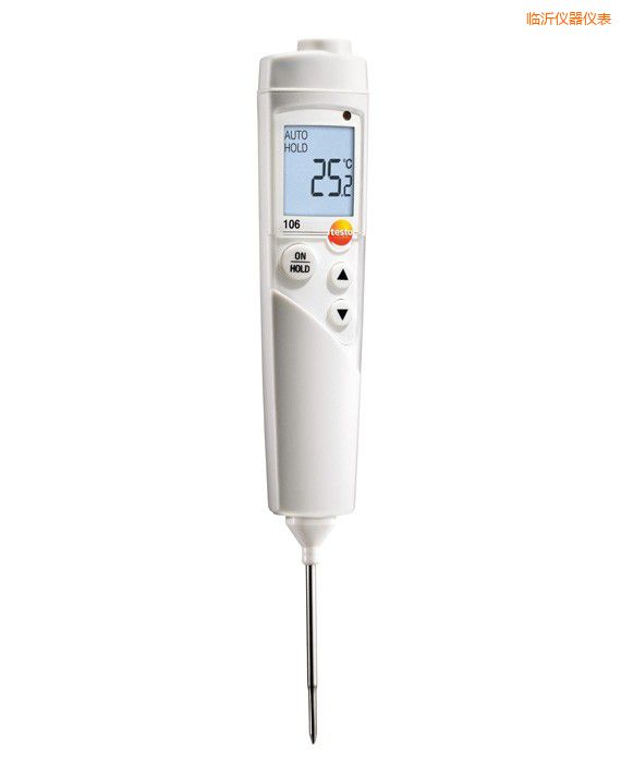 testo 106防水型食品中心溫度計,包括探頭保護(hù)帽和電池。