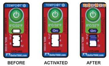 TempDot™Plus標(biāo)簽應(yīng)存儲(chǔ)在室溫下,并必須在反應(yīng)溫度閾值以上被激活。激活是通過用手指推壓。"On"字出現(xiàn)在第一個(gè)窗口中顯示激活。之后5分 鐘內(nèi),在反應(yīng)溫度或低于反應(yīng)溫度的情況下將標(biāo)簽貼到產(chǎn)品上。藍(lán)色染料熔化并以控制的速率遷移,經(jīng)過白色大窗口。這表示暴露在溫度閾值以上的累計(jì)時(shí)間。當(dāng)溫 度低于閾值時(shí),該染料固化并停止移動(dòng)。如果溫度超過閾值,,TempDot®Plus標(biāo)簽提供即時(shí)的視覺跡象。