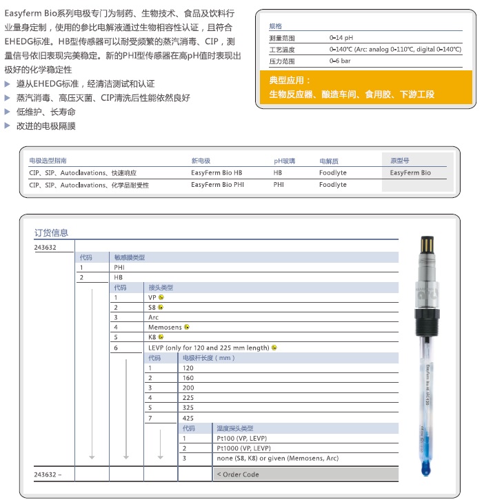 Easyferm Bio系列電極專門為制藥、生物技術(shù)、食品及飲料行業(yè)量身定制,,使用的參比電解液通過生物相容性認證,,且符合EHEDG標(biāo)準(zhǔn)。HB型傳感器可以耐受頻繁的蒸汽消毒、CIP,,測量信號依舊表現(xiàn)完美穩(wěn)定。新的PHI型傳感器在高Ph值時表現(xiàn)出極好的化學(xué)穩(wěn)定性。