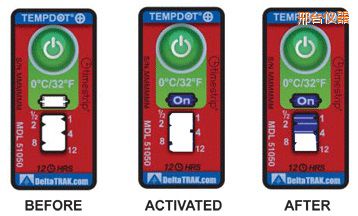 TempDot™Plus標(biāo)簽應(yīng)存儲(chǔ)在室溫下,,并必須在反應(yīng)溫度閾值以上被激活。激活是通過用手指推壓。"On"字出現(xiàn)在第一個(gè)窗口中顯示激活。之后5分 鐘內(nèi),在反應(yīng)溫度或低于反應(yīng)溫度的情況下將標(biāo)簽貼到產(chǎn)品上。藍(lán)色染料熔化并以控制的速率遷移,,經(jīng)過白色大窗口。這表示暴露在溫度閾值以上的累計(jì)時(shí)間。當(dāng)溫 度低于閾值時(shí),該染料固化并停止移動(dòng)。如果溫度超過閾值,TempDot®Plus標(biāo)簽提供即時(shí)的視覺跡象。