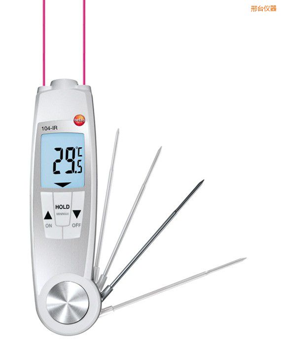 紅外及接觸式測(cè)溫二合一testo 104-IR配備精確的2點(diǎn)瞄準(zhǔn)激光,光學(xué)分辨率10:1,家用溫度計(jì)哪種好,測(cè)量范圍清晰可見,溫度計(jì)中的金屬元素,可隨時(shí)進(jìn)行快速并精確的表面溫度測(cè)量。二合一溫度測(cè)量?jī)x特別適用于食品進(jìn)貨檢測(cè)以及快速檢測(cè)單個(gè)或整箱食品的表面溫度。 刺入式溫度探頭適用于測(cè)量如肉類和香腸等食品的核心中心溫度。通常,在紅外表面溫度測(cè)量不足以判定食品安全的情況下使用。刺入式探頭在不使用時(shí)可通過折疊方式收入儀器中,以防折斷損壞。