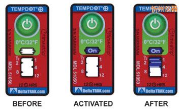TempDot™Plus標簽應(yīng)存儲在室溫下,并必須在反應(yīng)溫度閾值以上被激活。激活是通過用手指推壓。"On"字出現(xiàn)在第一個窗口中顯示激活。之后5分 鐘內(nèi),,在反應(yīng)溫度或低于反應(yīng)溫度的情況下將標簽貼到產(chǎn)品上。藍色染料熔化并以控制的速率遷移,經(jīng)過白色大窗口。這表示暴露在溫度閾值以上的累計時間。當(dāng)溫 度低于閾值時,該染料固化并停止移動。如果溫度超過閾值,TempDot®Plus標簽提供即時的視覺跡象。