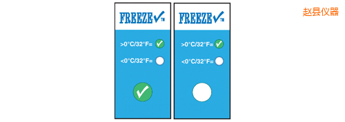 TempDot FreezeCheck標(biāo)簽,型號54000,用來表示溫度低于0°C。如果溫度低于0°C,標(biāo)簽不可逆轉(zhuǎn)地發(fā)生變化,變成白色,,勾形標(biāo)記消失。 冷凍檢查標(biāo)簽用來指示溫度低于0°C. 當(dāng)溫度下降到低于臨界點(diǎn), 指示劑不可逆轉(zhuǎn)的改變從清晰到白色并且綠色合格標(biāo)志不再顯示。