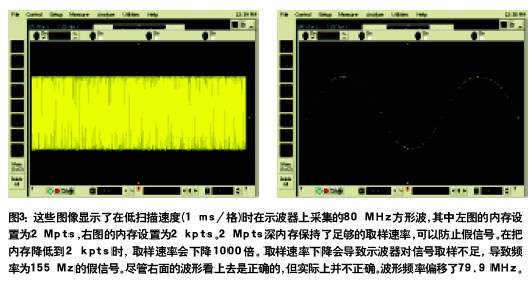 許多人認(rèn)為示波器的最大取樣速率指標(biāo)適用于所有時基設(shè)置。這當(dāng)然是好事但這可能要求非常大的內(nèi)存幾乎沒有人能夠買得起內(nèi)存這樣大的示波器。由于內(nèi)存深度有限因此隨著人們把時基設(shè)置成越來越寬的范圍所有示波器必須降低取樣速率。示波器的內(nèi)存越深以全部取樣速率可以捕獲的時間越多。目前市場上有一種流行的示波器其取樣速率達(dá)到每秒幾千兆樣點及擁有10000樣點的內(nèi)存。在時基設(shè)為2ms/格及更慢時這一示波器被迫把取樣速率降低到每秒幾千樣點。你必需查看有問題的示波器了解時基設(shè)置對其取樣速率的影響。這里提到的示波器在以要求的掃描速率工作、以顯示整個系統(tǒng)操作周期時將只提供幾千赫茲的帶寬。