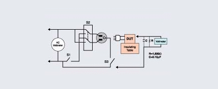 泄漏電流測試意指,當設備供應電壓時流經設備金屬可接觸部份經人體至接地部份或可接觸部份的電流。量測時須使用人體仿真線路MD并聯電壓表,水分測定儀維修其MD依不同的產品安規(guī)標準有不同的人體仿真線路而測試電壓為最不利的輸入電壓,一般訂額定電壓上限為測試電壓。