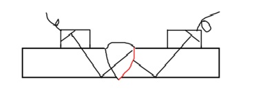 圖 1 對接焊焊縫余高未磨平、只能單面探測。可使用斜探頭、觀察一次或二次回波在焊縫兩側進行掃查探傷。