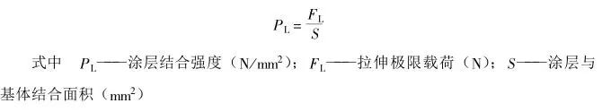 涂層拉伸強(qiáng)度是涂層承受法線方向(垂直于涂層表面)拉伸應(yīng)力的極限能力,這是評定涂層結(jié)合力的最重要指標(biāo)。試驗(yàn)中,利用試驗(yàn)工具或設(shè)備使試樣承受垂直于涂層表面的拉伸力,直至試樣被拉開,即涂層剝離,記下破壞時的載荷,以試樣的斷面積除此載荷值,即可計(jì)算出涂層的拉伸強(qiáng)度。如下式: