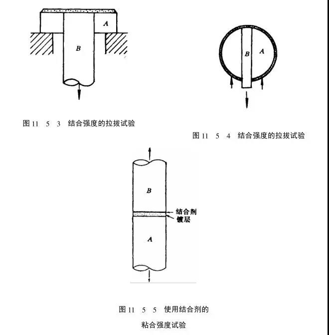 此外,對于軸類等圓柱形噴涂件,可如圖11_5_4所示,在圓柱形試件A上開孔,使活塞g通過,并使活塞的上表面曲率與圓柱試件的曲率相同,形成同一曲面后進(jìn)行噴涂,然后從下面支撐住圓柱試件,垂直向下拉拔活塞B,直至活塞上表面涂層被破壞,測出受力,再根據(jù)活塞斷面積,即可計(jì)算出涂層的結(jié)合強(qiáng)度。