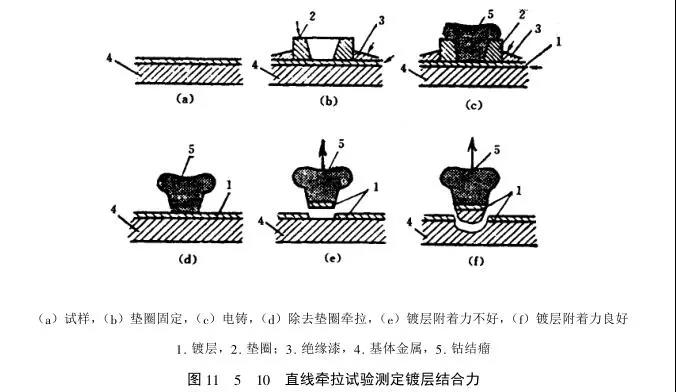 直線章拉試驗(yàn)可直接在鍍件上進(jìn)行。首先在試件鍍層表面,用一非導(dǎo)體墊國固定在被測部位上,并在墊國以外的鍍層表面加以絕緣層,然后在墊國以內(nèi)的鍍層上電鑄鈷或其它金屬,經(jīng)一定時間,在該鍍層上沿墊國內(nèi)壁形成一個金屬結(jié)瘤,電鑄結(jié)束后取下墊國,除去絕緣層,將鑄有金屬結(jié)瘤的試件置于專用的張力測試機(jī)上,以機(jī)械力將般層牽拉至斷裂見圖11_5_10。根據(jù)般層剝離時用力的大小及般層結(jié)合面積可計(jì)算出般層的結(jié)合強(qiáng)度。