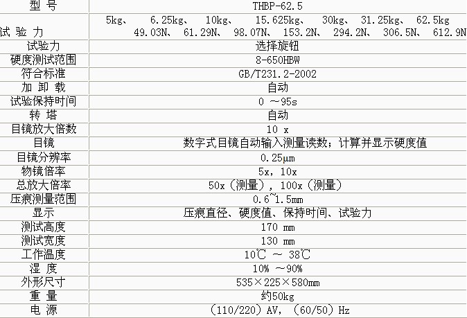 產(chǎn)品概述: THBP-62.5數(shù)顯小負荷布氏硬度計是光機電一體化的高新技術產(chǎn)品,濰坊布氏硬度計生產(chǎn)廠家,它造型新穎、美觀,山東萊州布氏硬度計,具有良好的直觀性、可操作性和可靠性,布氏硬度計 價格,是測試小負荷布氏硬度的理想產(chǎn)品。 功能特點: 1 、 儀器具備7級試驗力,8種測試的布氏標尺任意選擇; 2、具備了5x 和10x 兩組物鏡,布氏硬度計操作視頻,且都能參與測量; 3、物鏡和壓頭間智能式自動切換; 4、預置試驗力保持時間、調(diào)節(jié)測量光源的強弱功能; 5、自動顯示測量壓痕長度、硬度值、測量次數(shù)等;帶熱敏打印機。 6、硬度測試結果打印輸出,RS232超級終端設置,硬度計價格,供用戶擴展功能。 7、硬度計還可根據(jù)用戶特殊需求配置CCD裝置、視屏測量裝置和攝像裝置。 8、本儀器采用精密的結構設計,進口布氏硬度計,試驗力施加由力值傳感器控制,華銀硬度計,使整機結構緊湊,加卸試驗力時平穩(wěn)、準確。在電氣上由CPU控制試驗過程,布氏硬度計說明書,物鏡和壓頭采用智能式自動切換,東莞硬度計,切換定位采用機械與電子雙重配合,萊州布氏硬度計,使定位精度更高。 9、本儀器適用于測量鑄鐵、有色金屬及合金材料,各種退火、調(diào)質(zhì)處理后的鋼材。特別是較軟的金屬如:鋁、鉛、錫等材料測試的硬度值更正確。 技術參數(shù):